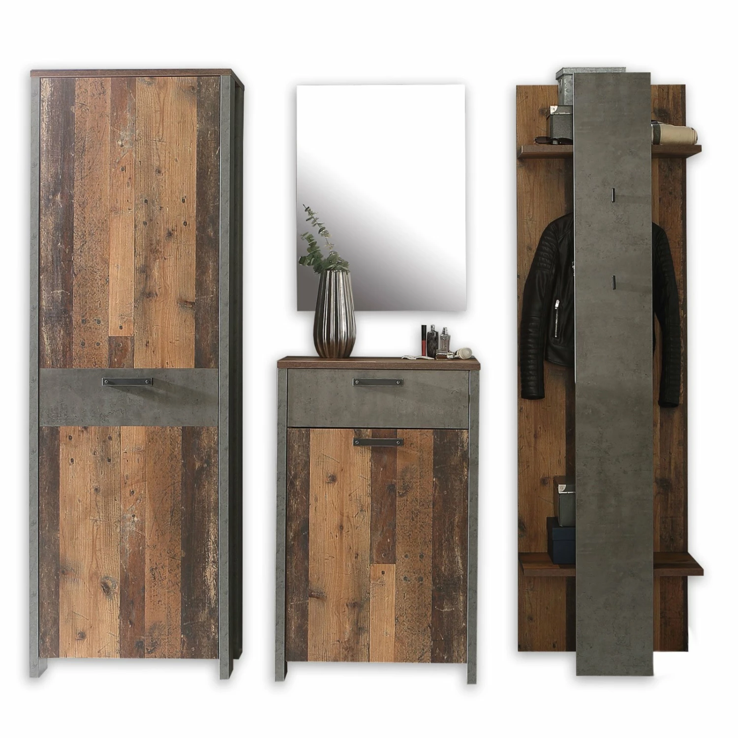 Das 4-teilige Garderoben-Set wird für einen modernen Touch in Ihrem Eingangsbereich sorgen! Es präsentiert sich im angesagten Industrial Style, der durch den Mix aus Old Wood Vintage Nachbildung und Betonoptik entsteht und diesem Programm das gewisse Etwas verleiht. Im Schuhschrank werden Ihnen hinter der Tür drei Fächer geboten, die viel Platz für Ihre Schuhe zur Verfügung stellen. Der Auszug bietet sich für kleinere Utensilien an. Der Garderobenschrank sorgt mit der Kleiderstange und dem Einlegeboden auch für Stauraum für Ihre Jacken, Schals und Taschen. Am Kleiderpaneel können Sie Jacken und Accessoires aufhängen, die Sie stets griffbereit haben müssen. Der Spiegel ist ebenfalls im Lieferumfang mit inbegriffen und ist bestens dafür geeignet, die Frisur und das Outfit vor dem Verlassen Ihrer vier Wände noch einmal zu prüfen.