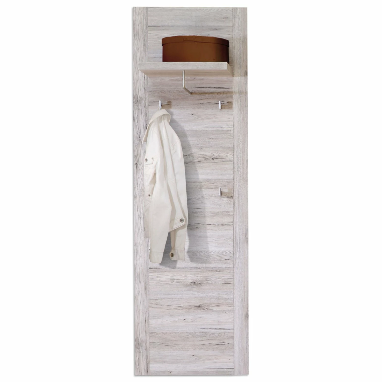 Mit diesem Garderoben-Set erhalten Sie alles, was Sie für Ihren Eingangsbereich benötigen. Im Schrank ist Platz für Ihre Regenjacken und auf dem Einlegeboden können Sie Mützen und Tücher ablegen, alles das, was Sie nicht jeden Tag benötigen. Im Schuhschrank können Sie, wie der Name schon sagt, Ihre Schuhe und Pantoffel verstauen. In den beiden Schubladen ist reichlich Platz für alles, was sie schnell zur Hand haben müssen, wenn Sie die Wohnung verlassen. Ihre tägliche Jacke und Taschen werden am Paneel immer bereit sein, egal ob auf einem Bügel an der Stange oder an einem der vier Haken.