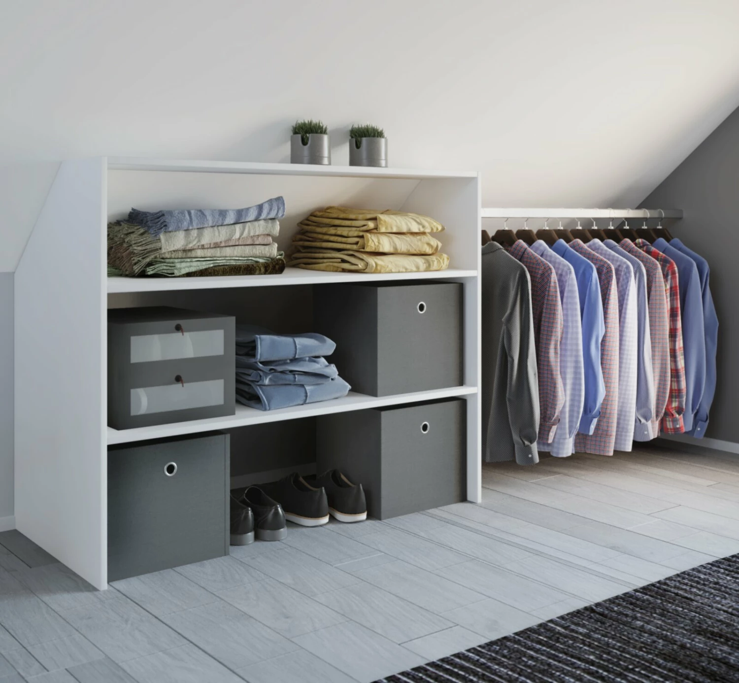 Das Dachschrägen-Regal DACHO in der Farbe Weiß. Jeder hat sich schon mal gefragt, wie man den Platz unter einer Dachschräge sinnvoll nutzen kann. Dieses Regal ist die Antwort. Es bietet insgesamt drei geräumige offene Fächer zum Verstauen von Kleidung oder anderen Utensilien und eine in der Länge verstellbare Kleiderstange. Das Regal ist jedoch nicht nur praktisch, sondern auch optisch ein echter Hingucker. Es eignet sich hervorragend um Ihre Lieblingsdekoration zu präsentieren. Dieses Regal ist ein wahrer Segen für jeden mit einer Dachschräge in der Wohnung.
