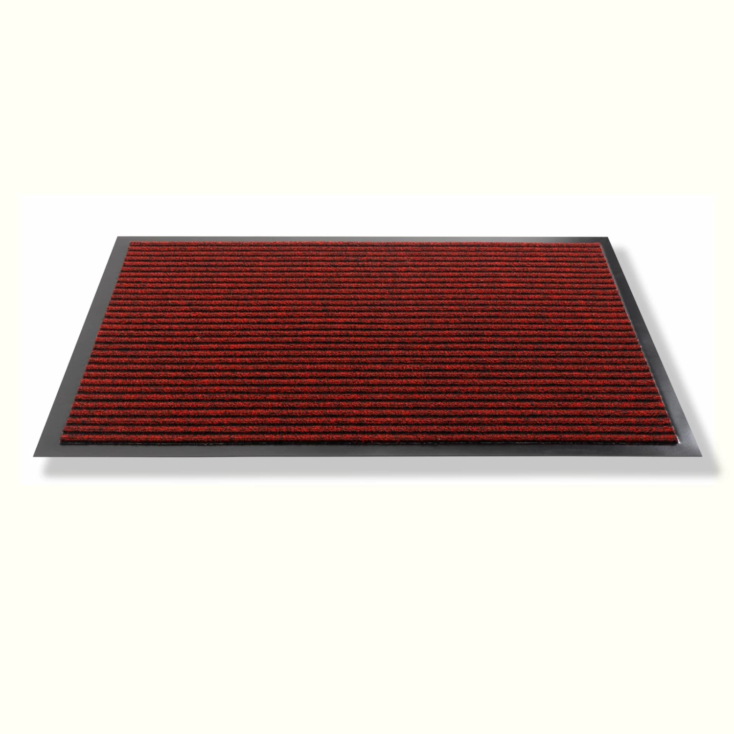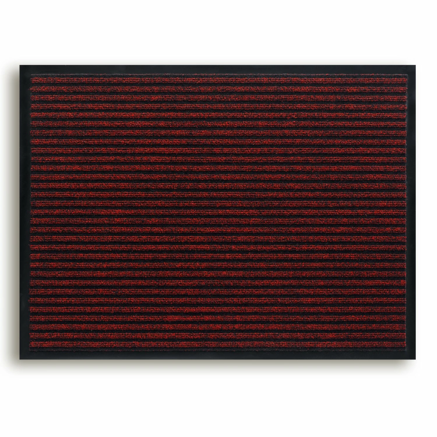 Praktische Fußmatte in Rot mit schwarzen Streifen. Die Matte besteht aus Polypropylen und die rutschfeste Gummiunterseite sorgt für guten Halt.