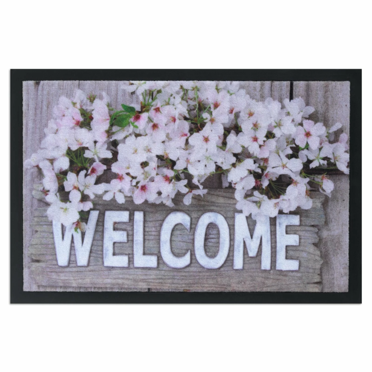 Auf diese Fußmatte wurde ein schönes Bild mit Blümchen und der wichtigen Botschaft „Welcome“ gebracht. Diese ist so dünn, dass auch eine Tür darüber passt und daher überall eingesetzt werden kann. Die Rückseite ist aus Vinyl, welches rutschhemmend wirkt.