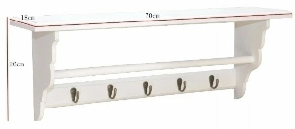 Hübsche Garderobe in Weiß mit fünf großen Metallhaken und einer großzügigen Ablagefläche für Hüte, Schals oder andere Accessoires.