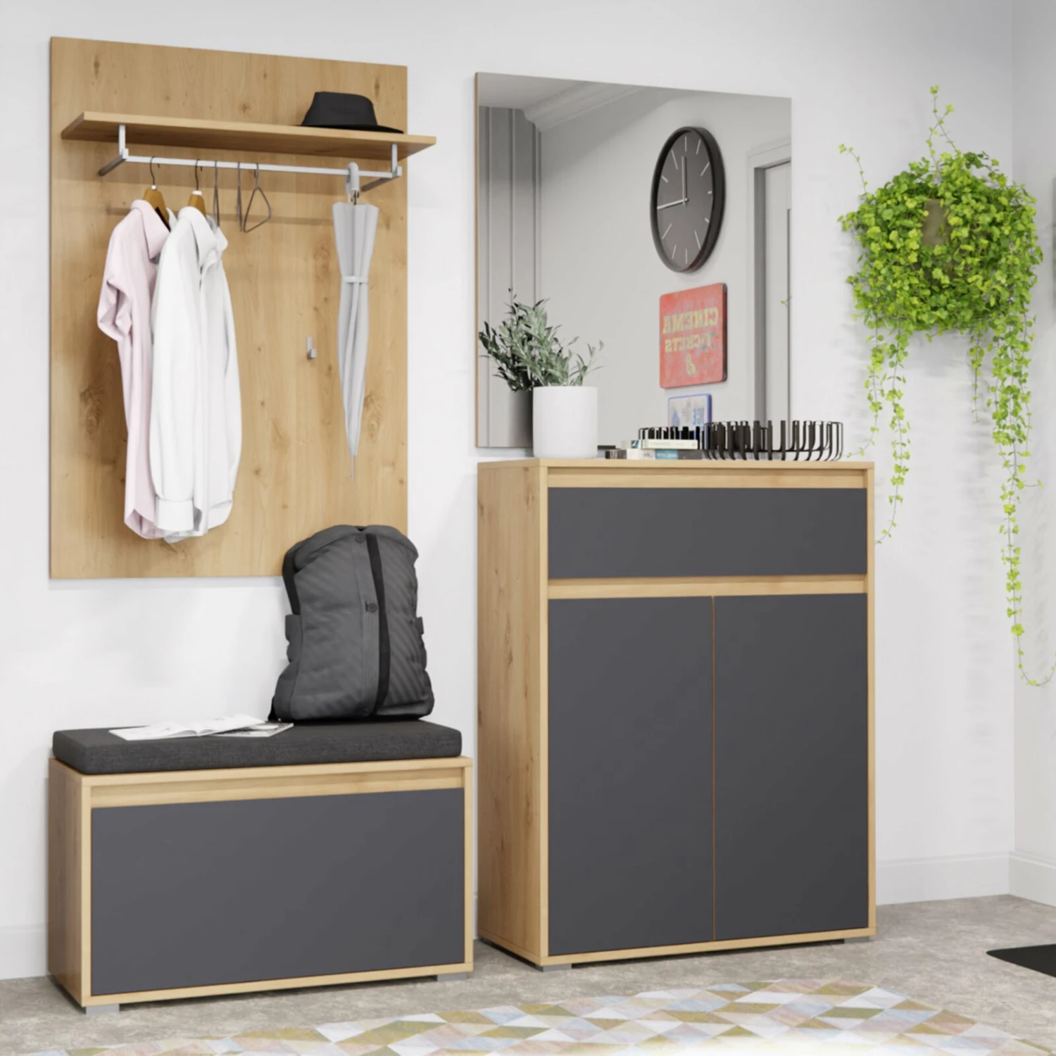 Dieses Garderobenpaneel TORINO präsentiert sich in einer schlichten Eiche Nachbildung. Ausgestattet ist es mit einer Hutablage, einer Kleiderstange und zwei Haken für deine Jacken.