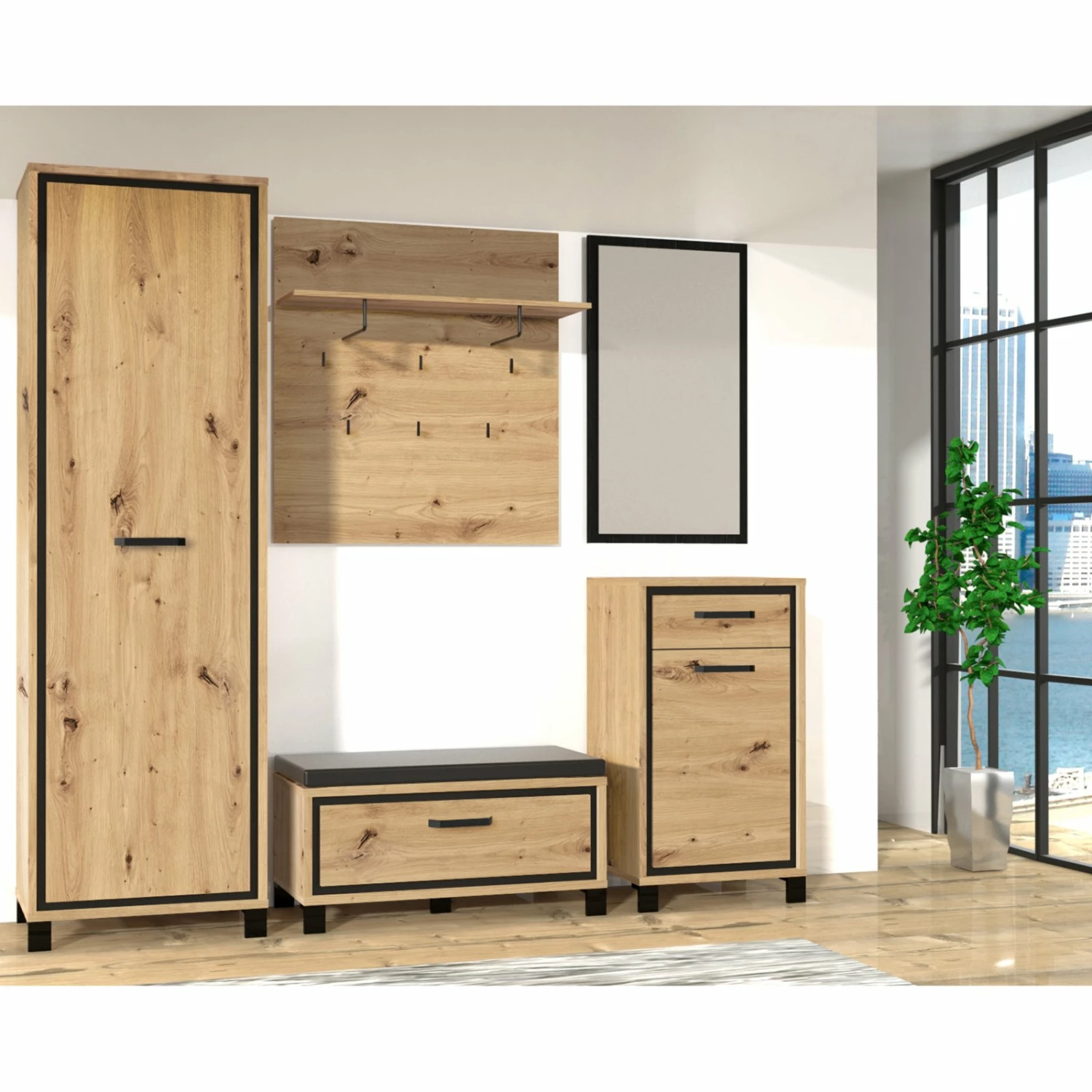 Der Garderobenschrank bietet Ihnen nicht nur Stauraum für Jacken, Hüte und Co., zudem wird er in Ihrer Diele für ein modernes Ambiente sorgen. Hier spiegelt sich durch den Mix aus Artisan Eiche und Schwarzeiche Nachbildung der angesagte Industrial-Style wider, der das gewisse Etwas in Ihrem Raum versprühen wird. Hinter der Tür steht Ihnen eine Kleiderstange und eine Ablage für Ihre Garderobe zur Verfügung.