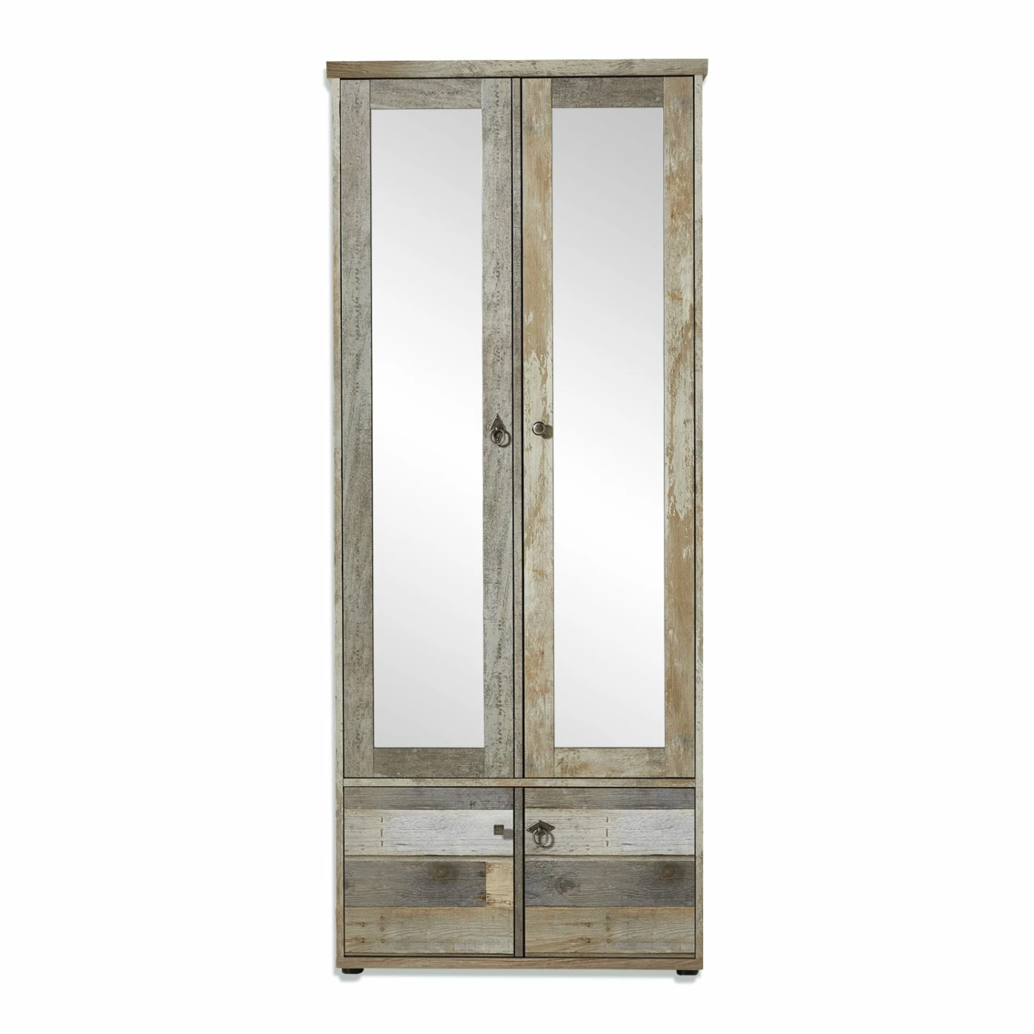 Dieser Garderobenschrank bringt Leben in Ihren Eingangsbereich. Durch die Driftwood Nachbildung entsteht eine lockere Atmosphäre. Die beiden Drehtüren sind mit jeweils einem Spiegel ausgestattet. Im Inneren wartet eine Kleiderstange nur darauf, mit Ihren Jacken behangen zu werden.