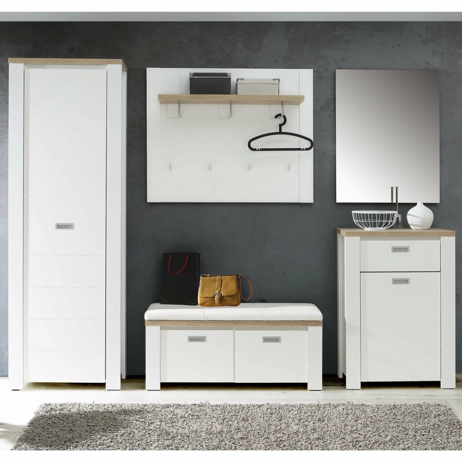 Ein wunderschöner Garderobenschrank mit viel Stauraum. In Weiß gehalten ist er zeitlos und leicht zu kombinieren. Die Absetzung in Eiche Bianco Nachbildung macht ihn zu einem tollen Hingucker. Ob in Kombination mit den gleichnamigen Garderobenprogramm oder einzeln macht dieser Schrank eine tolle Figur.