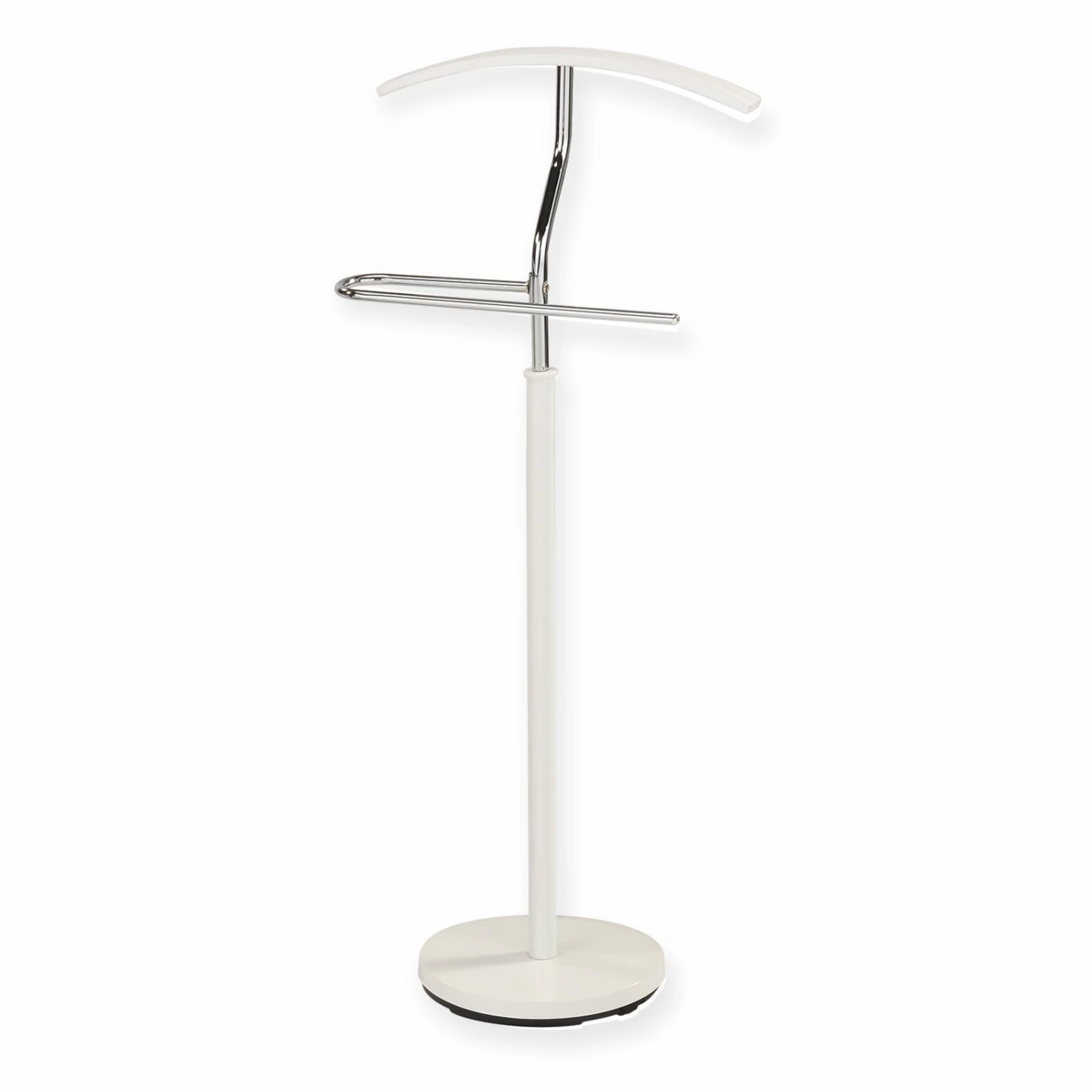 Der weiße und äußerst praktische Herrendiener ist aus verchromtem Metall und bietet mit seinen 2 Halterungen optimale Aufhängemöglichkeiten für Hosen, Sakkos und Hemden. So bleibt ihre Kleidung knitterfrei und ist jederzeit griffbereit.
