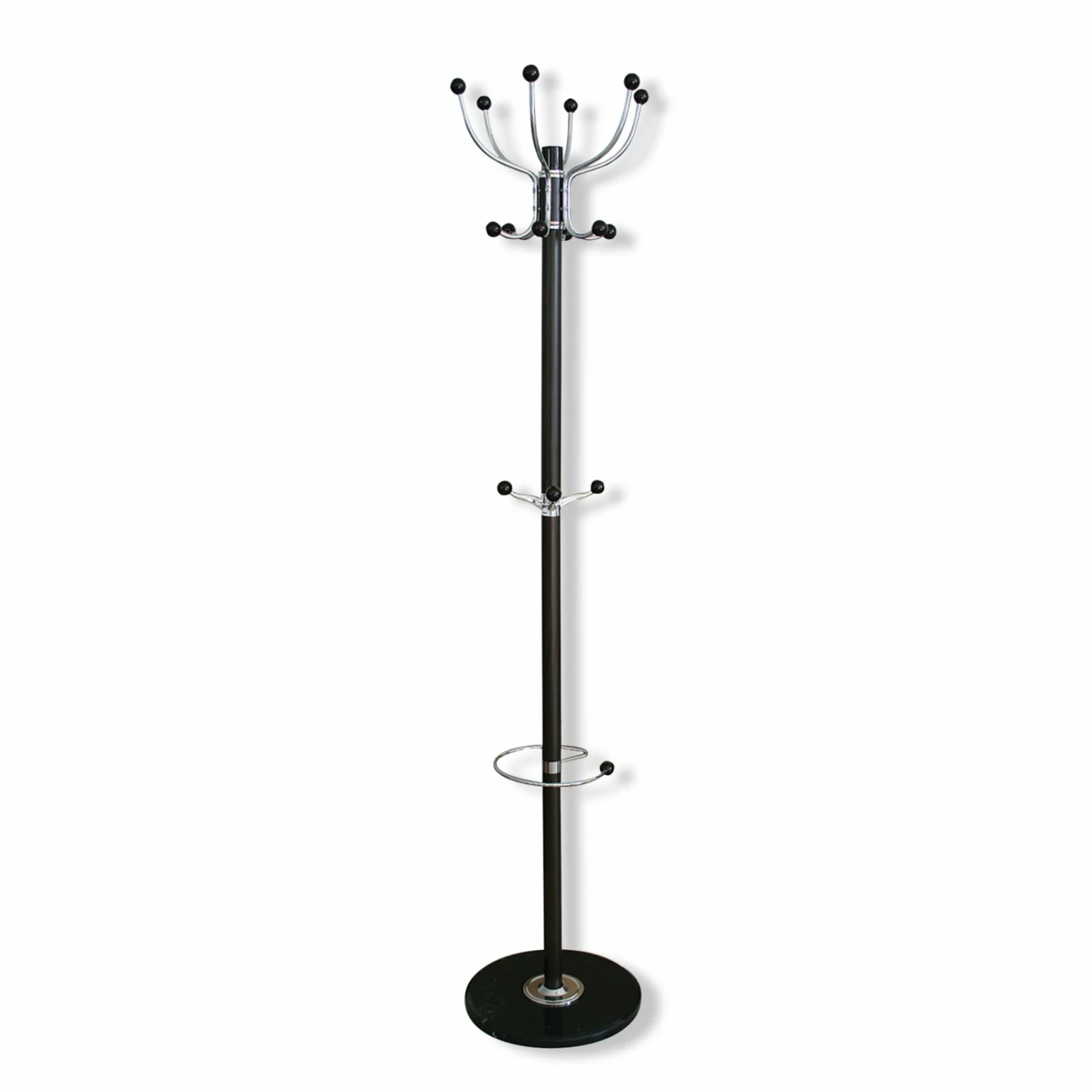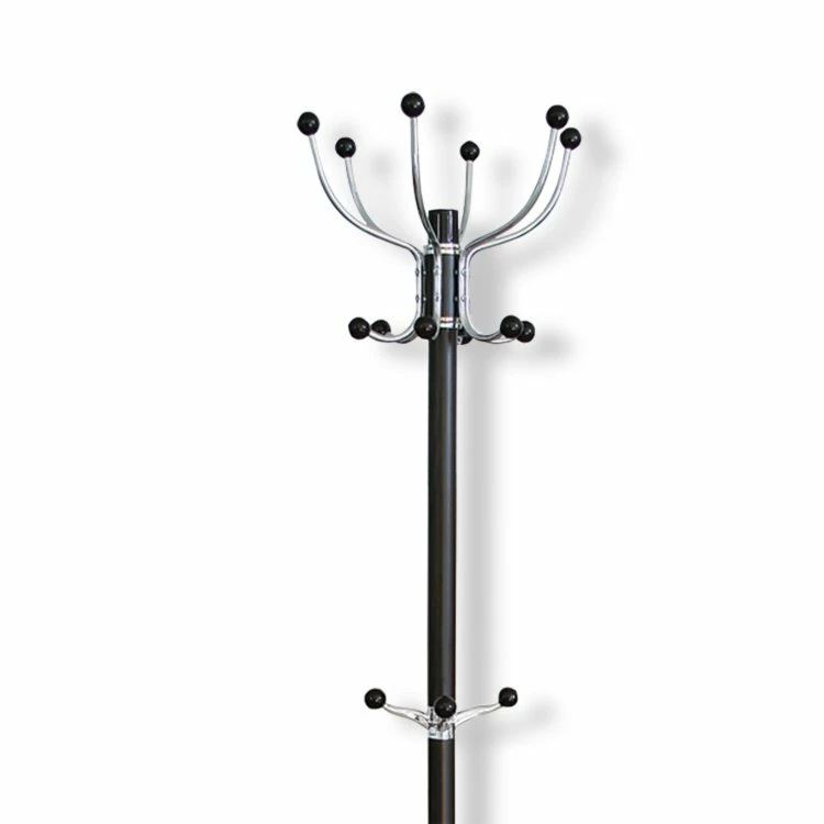 Dieser praktische Kleiderständer im Retro-Design mit einem stabilen Standfuss macht eine gute Figur in Ihrer Diele. Der Kleiderständer besteht aus robustem Stahl und verfügt über verchromte Kleiderhaken an denen schwarze Holzkugeln den Abschluss bilden.