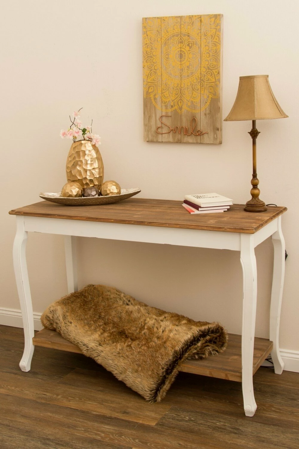 Der Konsolentisch ADRIANA ist in Weiß gehalten mit geschwungenen Beinen. Eine Tischplatte und eine Ablagefläche in Naturtönen steht im harmonischen Kontrast zum Gestell. Platzieren Sie diesen Tisch in der Diele oder Verwenden ihn als Schmink- und Frisiertisch.