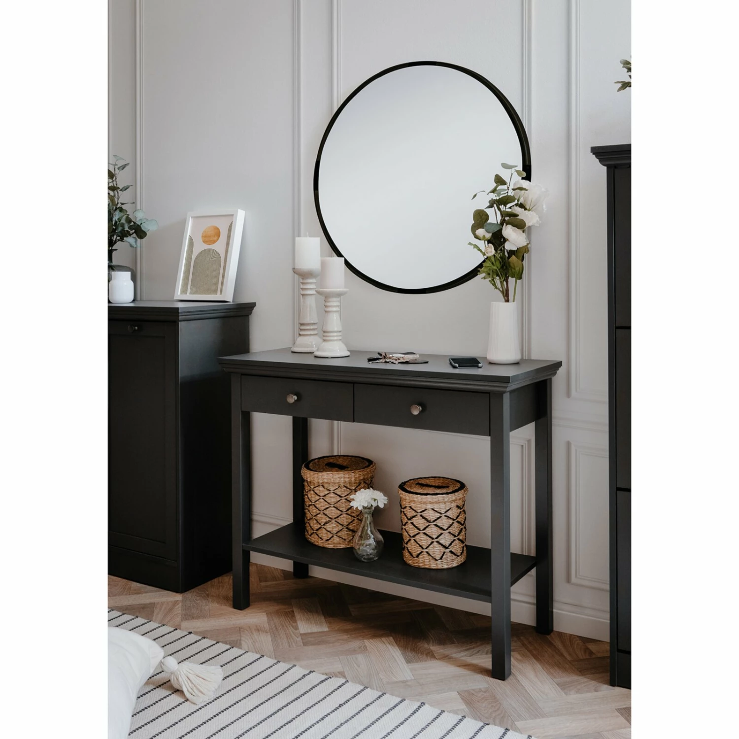 Der anthrazitfarbene Konsolentisch VERA lässt sich vielseitig einsetzen. Hier können Sie beispielsweise Schlüssel oder ähnliches ablegen. In zwei Schubkästen steht weiterer Stauraum bereit.