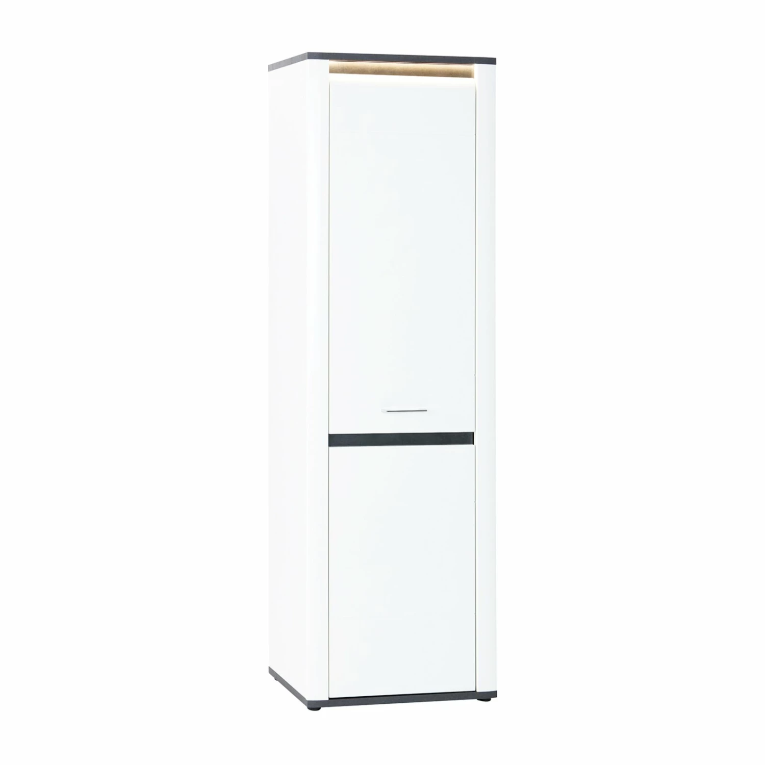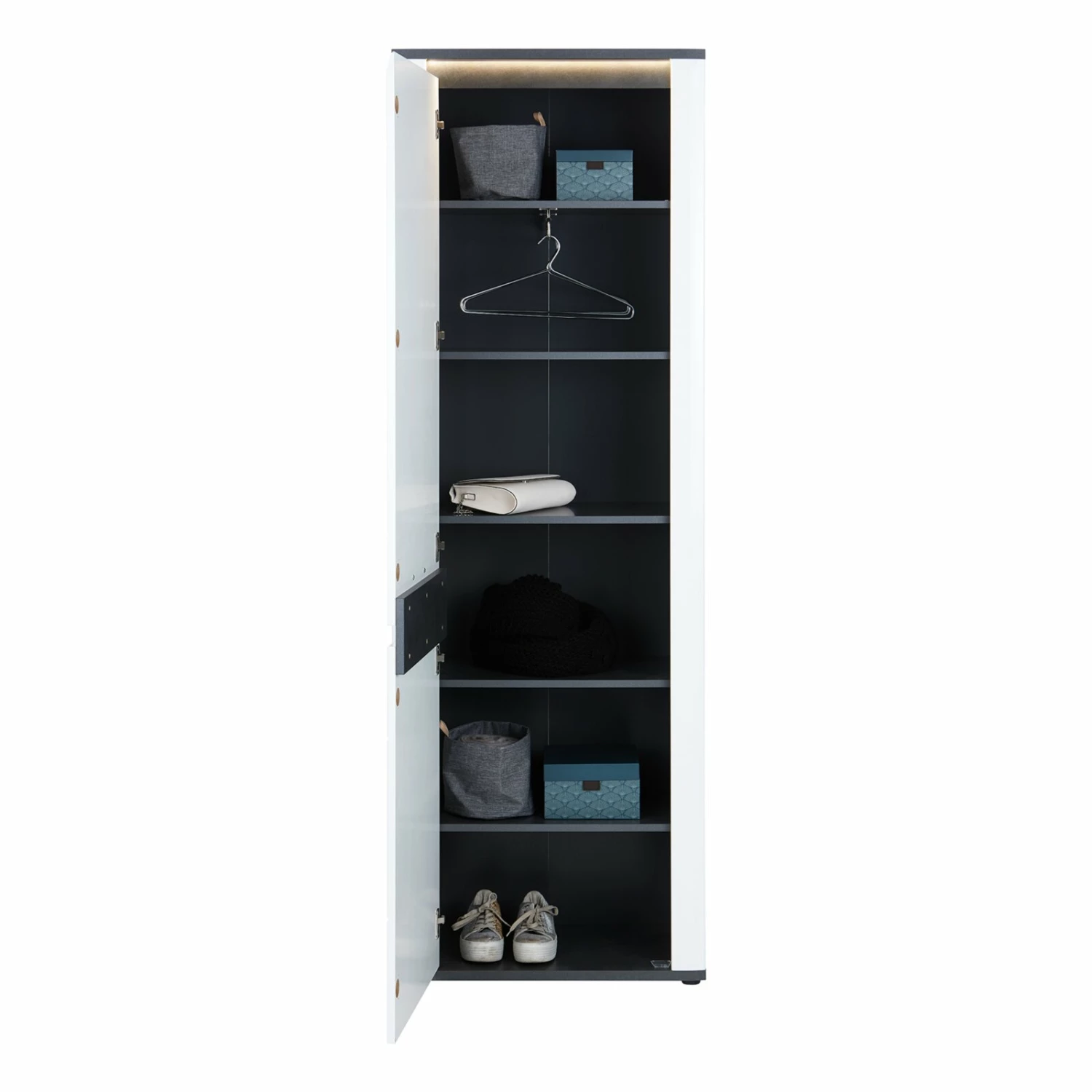 Auf eine Höhe von 200 cm erhebt sich der weiß glänzende Garderobenschrank und bietet mit vier Einlegeböden viel Platz für mehr Ordnung in Ihrem Eingangsbereich. Hier verbinden sich Form und Funktionalität. Besonders spannend sind die Extras: Der Schrank ist mit einem tageslichtweißen LED-Licht ausgestattet sowie einem Soft-Close-Mechanismus, mit dem Sie den Schrank sanft schließen können.