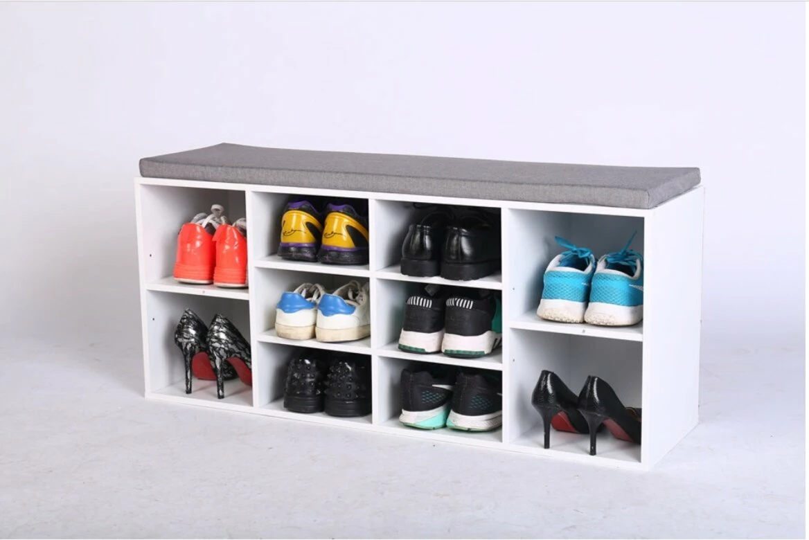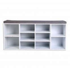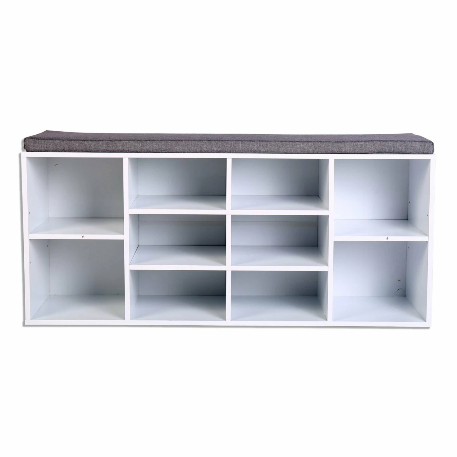 Machen Sie es sich beim Schuheanziehen auf der weißen Schuhbank HAPPY HOME gemütlich! Das Sitzkissen ist mit einem Polyesterbezug ausgestattet und erhöht den Komfort. Die Schuhbank bietet allerdings nicht nur eine Sitzmöglichkeit, sondern auch Platz für Ihre Schuhe und andere Accessoires. Diesen Stauraum finden Sie in den zehn offenen Fächern.