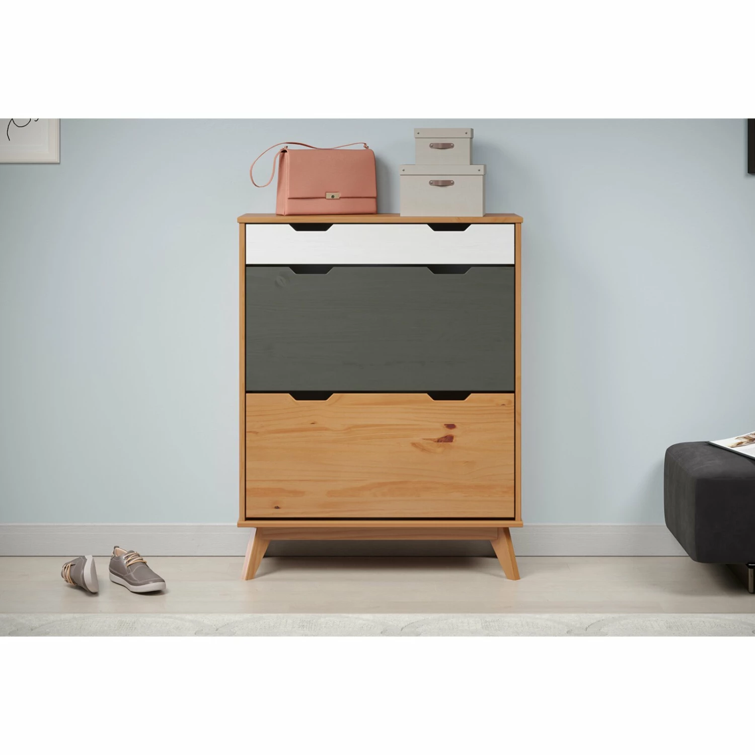 Der Schuhkipper bringt endlich Ordnung in Ihre Wohnung. Mit seinen zwei Klappen bietet er genug Platz für mehrere Paare. Außerdem ist das Möbelstück mit einem Schubkasten ausgestattet, in welchem Sie Ihre persönlichen Gegenstände verstauen können.