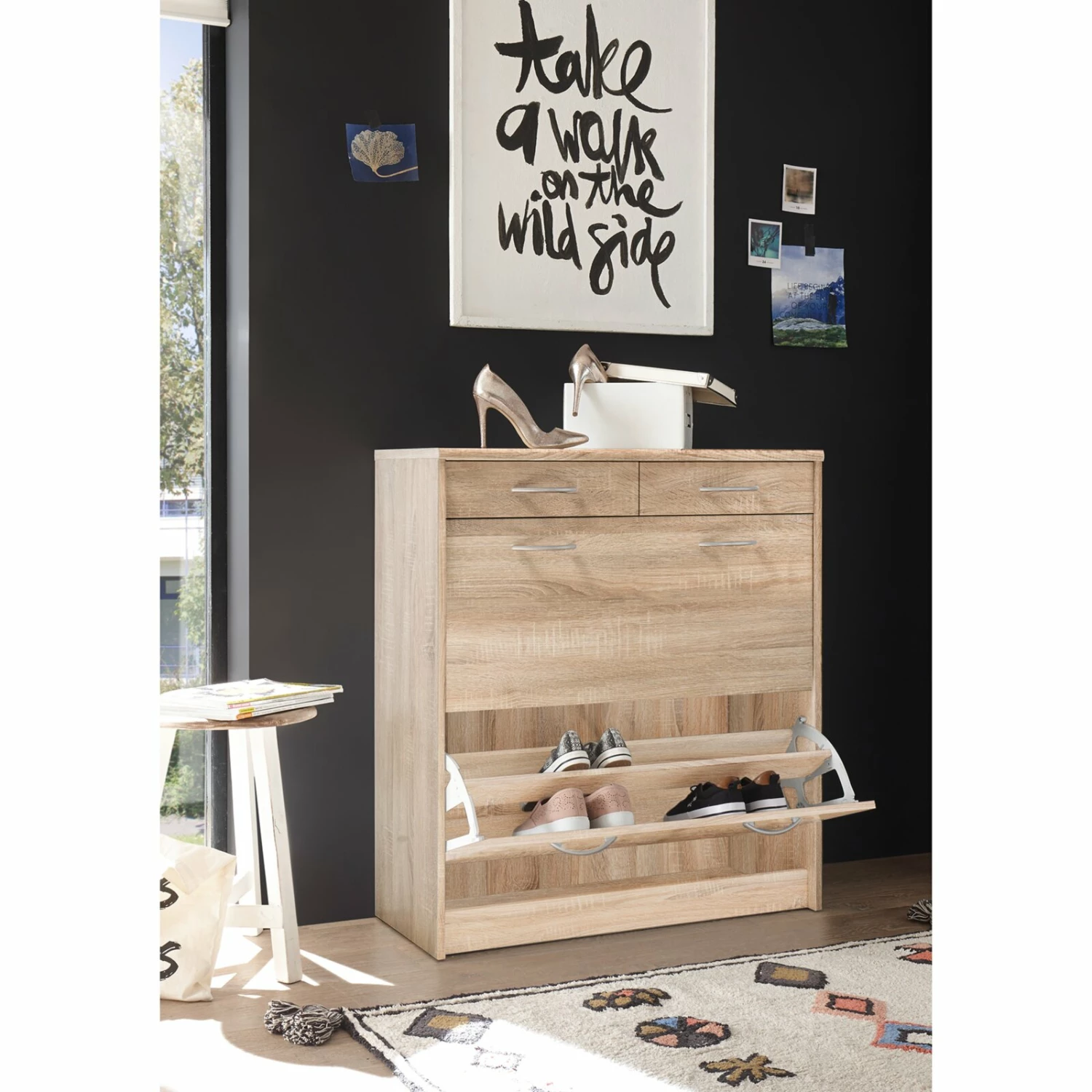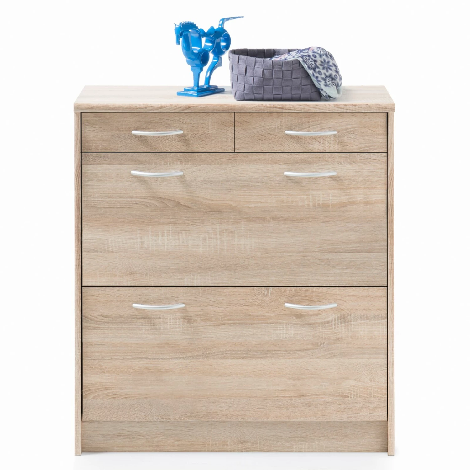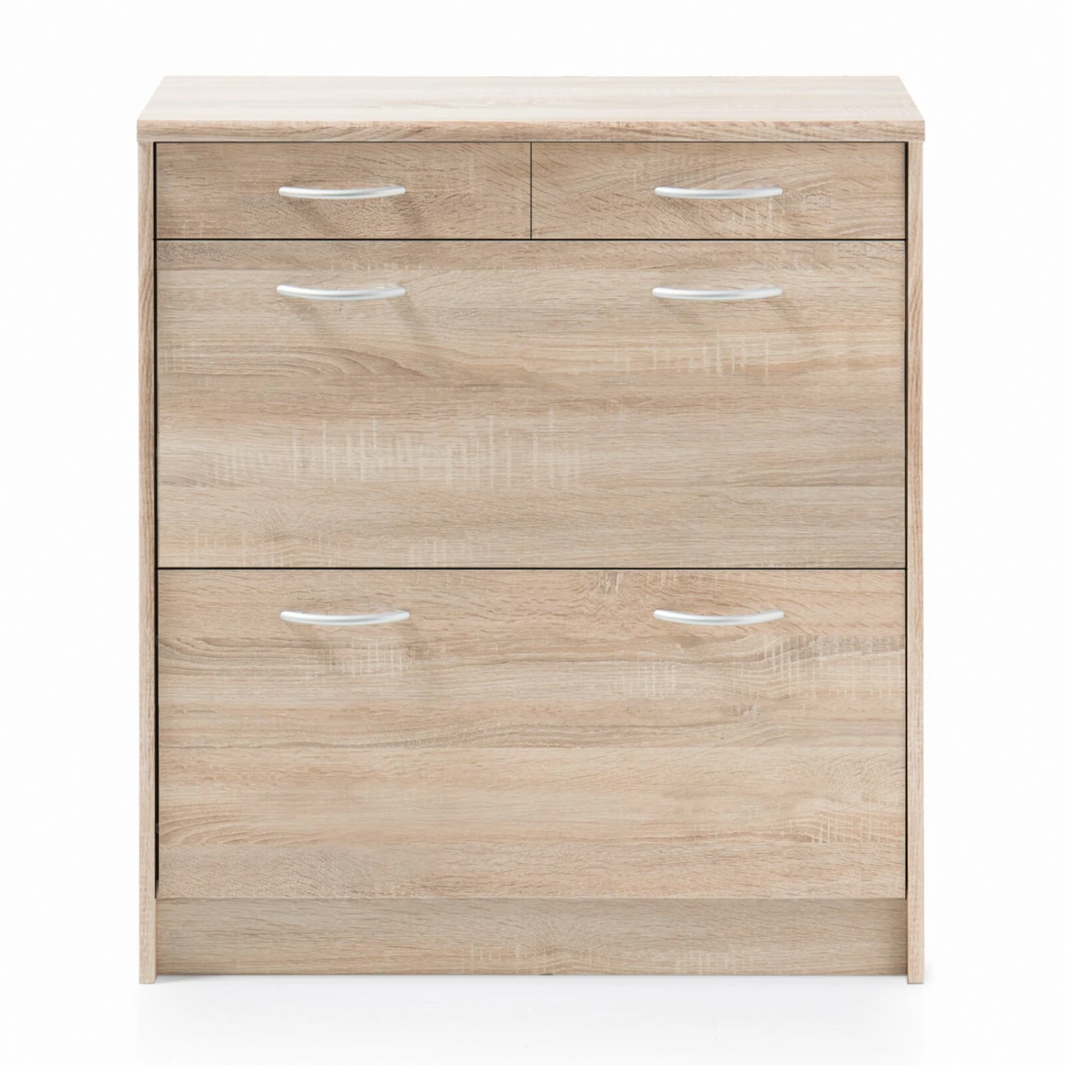 Praktischer Schuhschrank, der über zwei Klappen für Ihr Schuhwerk sowie zwei Schubkästen für beispielsweise Schuhputzzeug oder andere Utensilien verfügt. Die alufarbenen Griffe aus Kunststoff setzen sich optisch schön ab und erzeugen somit ein wohnliches Ambiente.