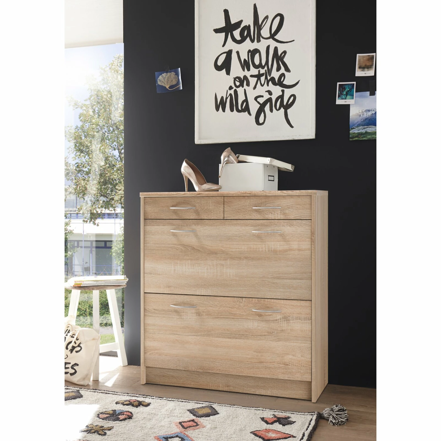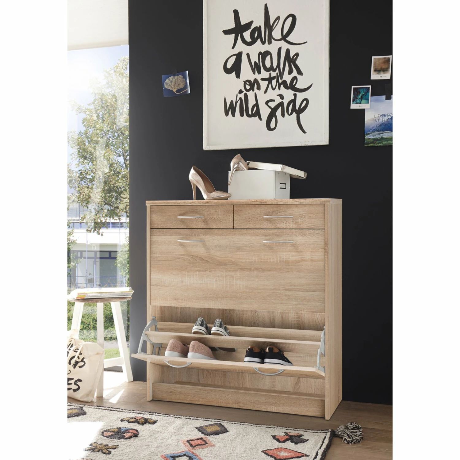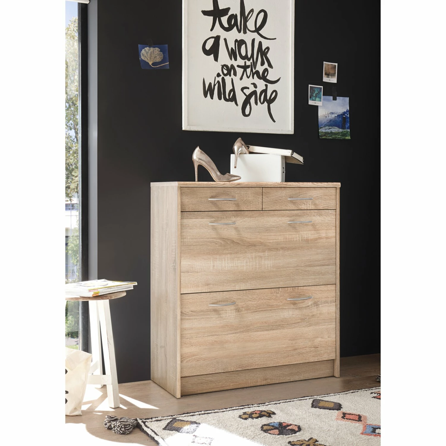 Praktischer Schuhschrank, der über zwei Klappen für Ihr Schuhwerk sowie zwei Schubkästen für beispielsweise Schuhputzzeug oder andere Utensilien verfügt. Die alufarbenen Griffe aus Kunststoff setzen sich optisch schön ab und erzeugen somit ein wohnliches Ambiente.