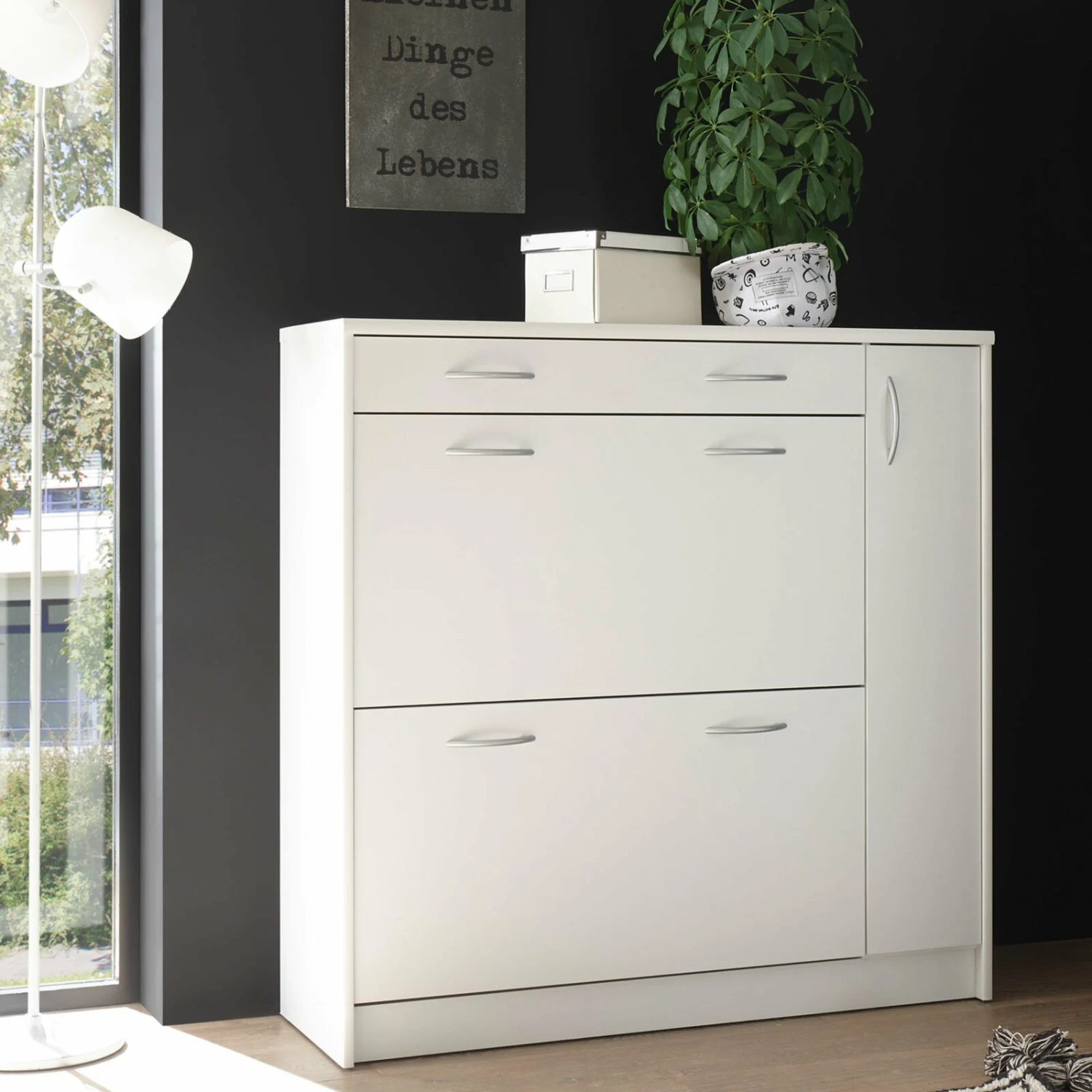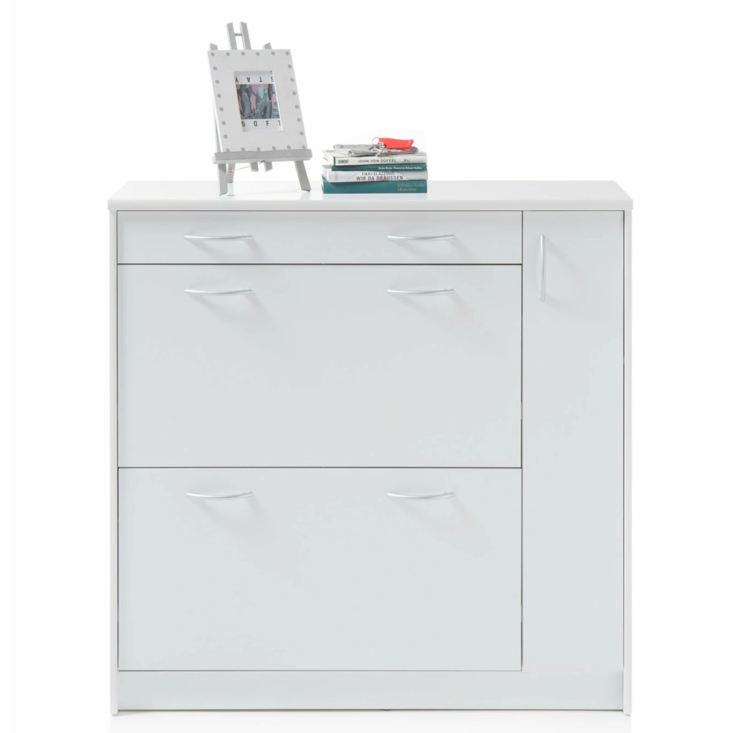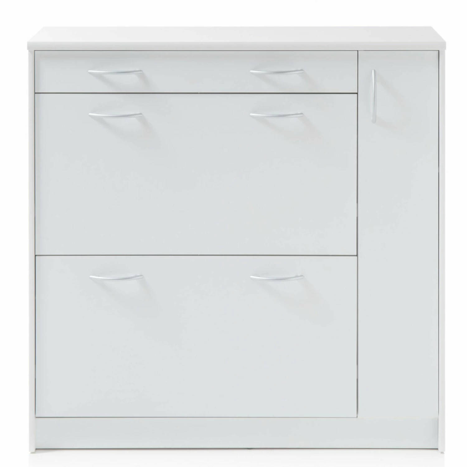 Praktischer Schuhschrank in Weiß, der über zwei Klappen für Ihr Schuhwerk sowie einem Schubkasten und einer Tür für beispielsweise Schuhputzzeug oder andere Utensilien verfügt. Die alufarbenen Griffe aus Kunststoff setzen sich optisch schön ab und erzeugen somit ein wohnliches Ambiente.