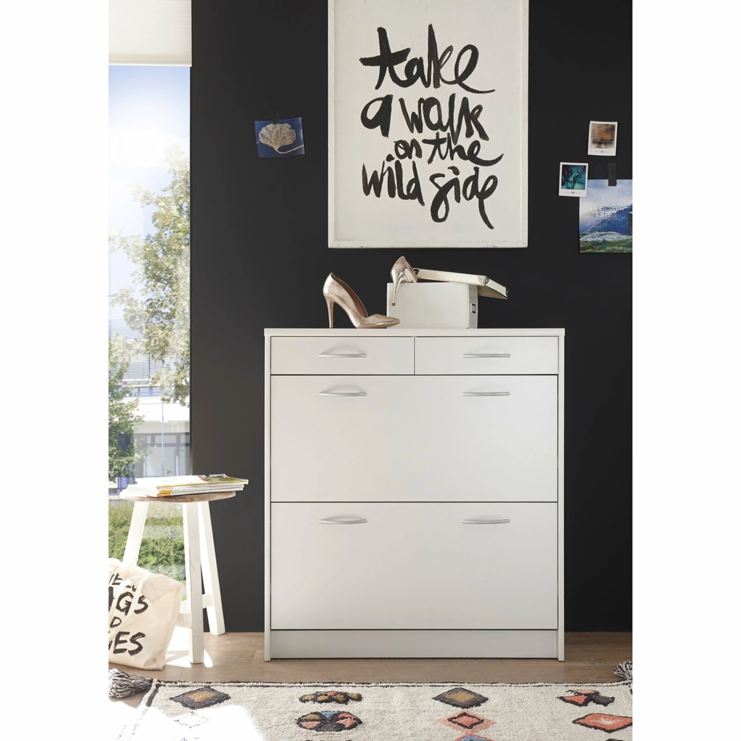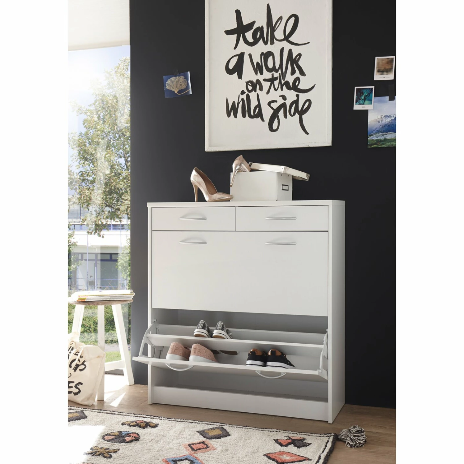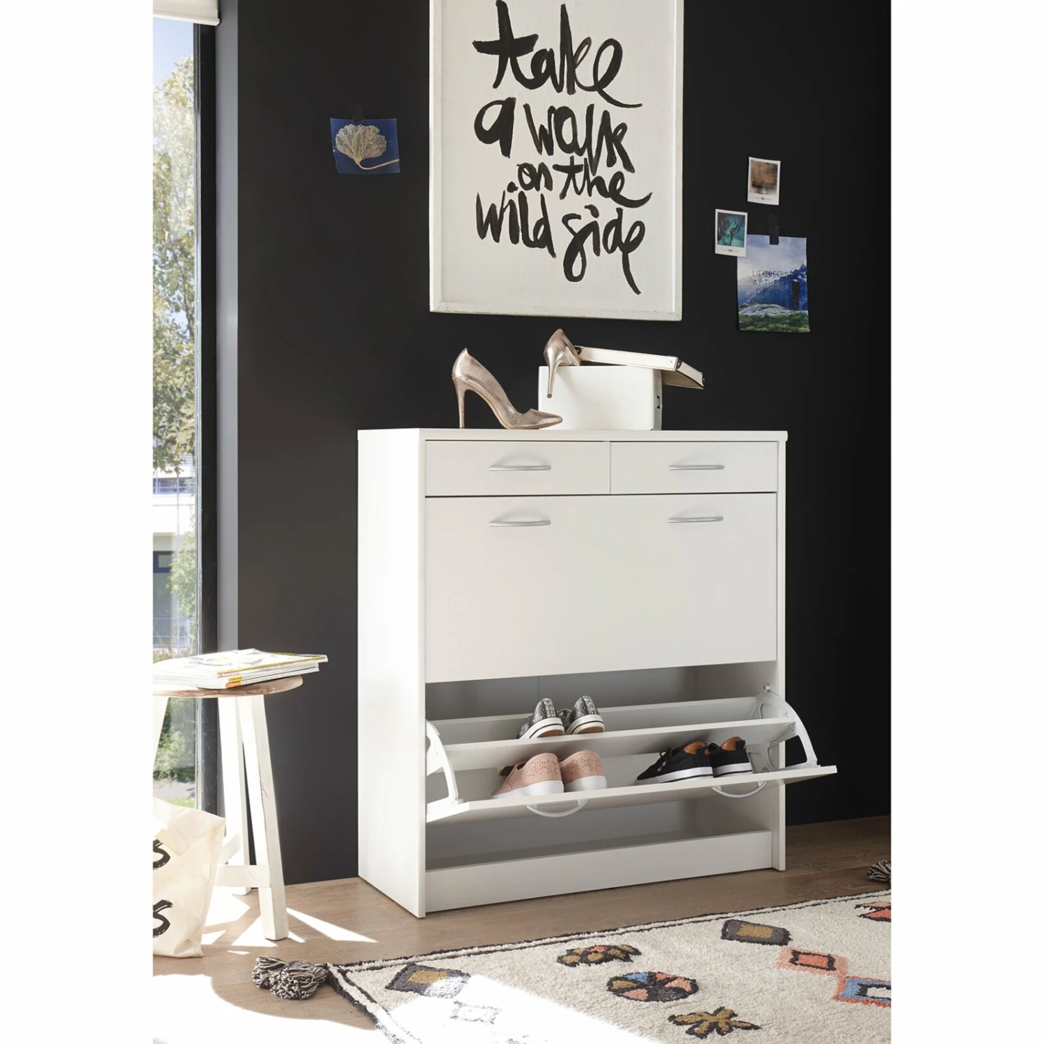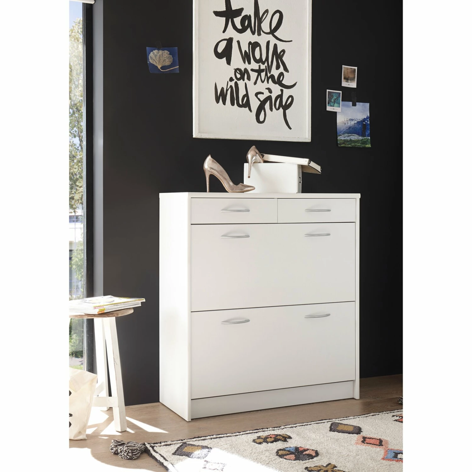Praktischer Schuhschrank, der über zwei Klappen für Ihr Schuhwerk sowie zwei Schubkästen für beispielsweise Schuhputzzeug oder andere Utensilien verfügt. Die alufarbenen Griffe aus Kunststoff setzen sich optisch schön ab und erzeugen somit ein wohnliches Ambiente.