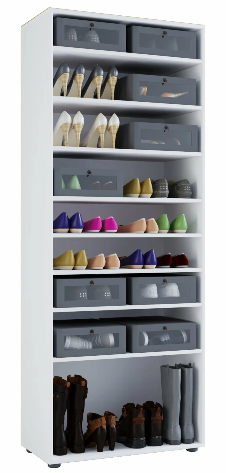 Das Schuhregal VANDOL I in Weiß bietet reichlich Stauraum für Ihre Schuhe. Platzieren Sie ihn im Eingangsbereich oder im Keller. Jeder in der Familie erhält sein Fach und so halten Sie einfach Ordnung. Alle Schuhe sind schnell griffbereit und in insgesamt 9 Fächern auch schnell wieder verstaut. Passen Sie die Einlegeböden Ihren Schuhen an.