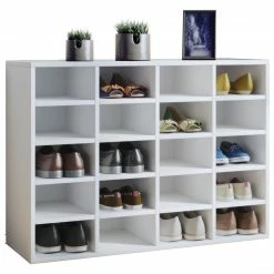 Der weiße Schuhschrank HINSOL L ist der ideale Aufbewahrungsort für Ihre Schuhe! Hier finden 20 Paare ihren eigenen Platz und werden durch die offen gehaltenen Fächer in Szene gesetzt. Oben auf der Ablage ist Platz für Dekorationen, wie zum Beispiel Pflanzen und Bilderrahmen. Das schlichte Design fügt sich zudem ganz einfach in den verschiedensten Einrichtungsstilen ein.