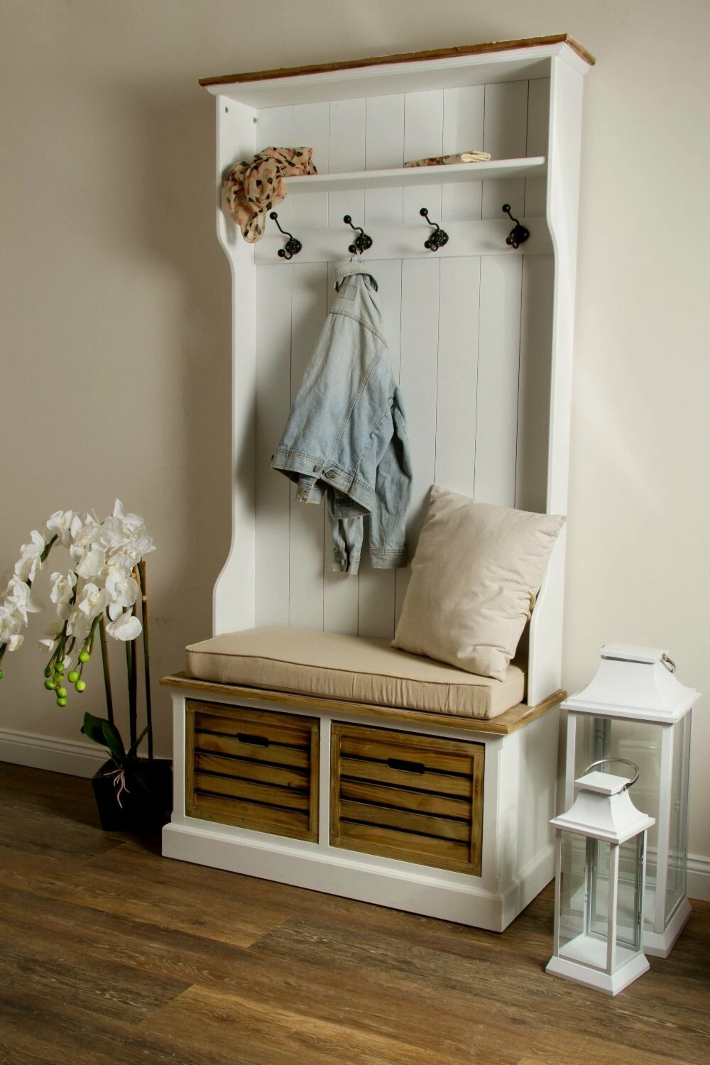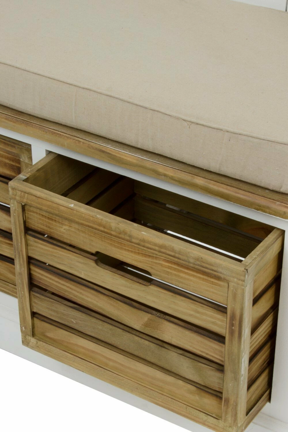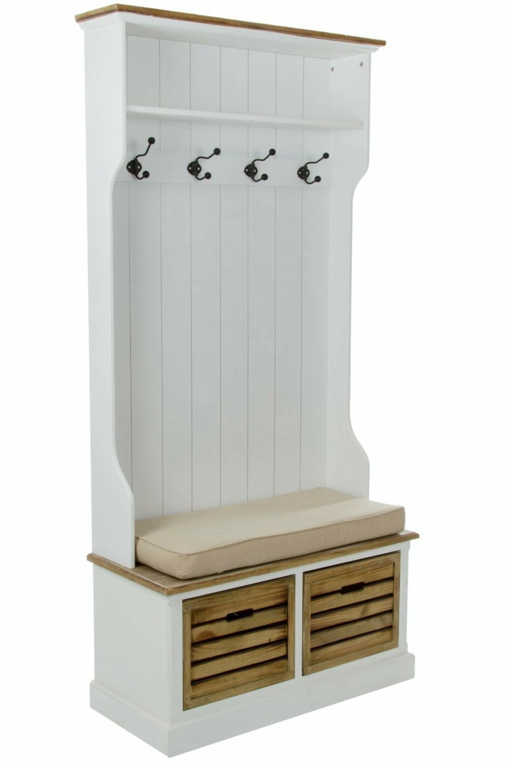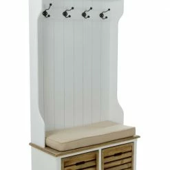 Bei der Sitzbank haben Sie alles in Einem! Sie bietet eine Sitzmöglichkeit, Haken zum Aufhängen Ihrer Jacken und praktische Holzkörbe zum Verstauen von Gebrauchsgegenständen. Die Körbe besitzen praktische Eingriffe und die Sitzbank wird durch ein gemütliches Kissen gepolstert, um Ihren Sitzkomfort beim Anziehen Ihrer Schuhe zu erhöhen.