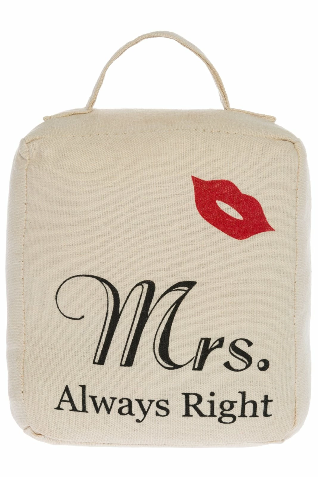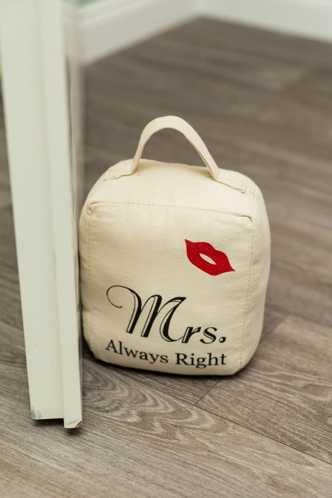 Dieser Türstopper MRS. ALWAYS RIGHT mit Aufschrift ist ein Wohnaccessoire, das nicht nur als nützlicher Helfer dient, sondern jedes Zuhause abrundet. Ein unverzichtlies Accessoires für frisch Verheiratete.