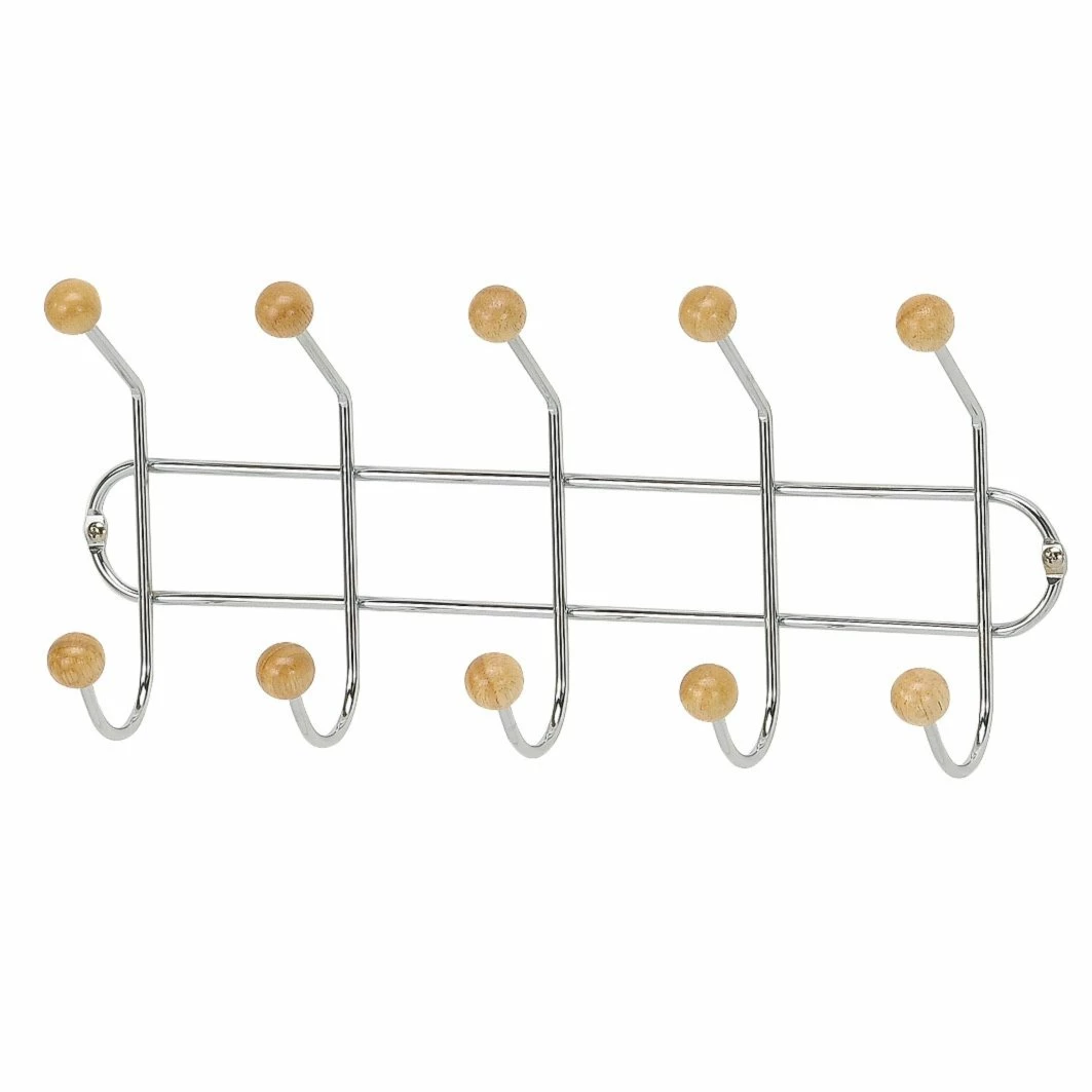 Schlichte Wandgarderobe aus chromfarbenen Metall und abgesetzt mit Holz.