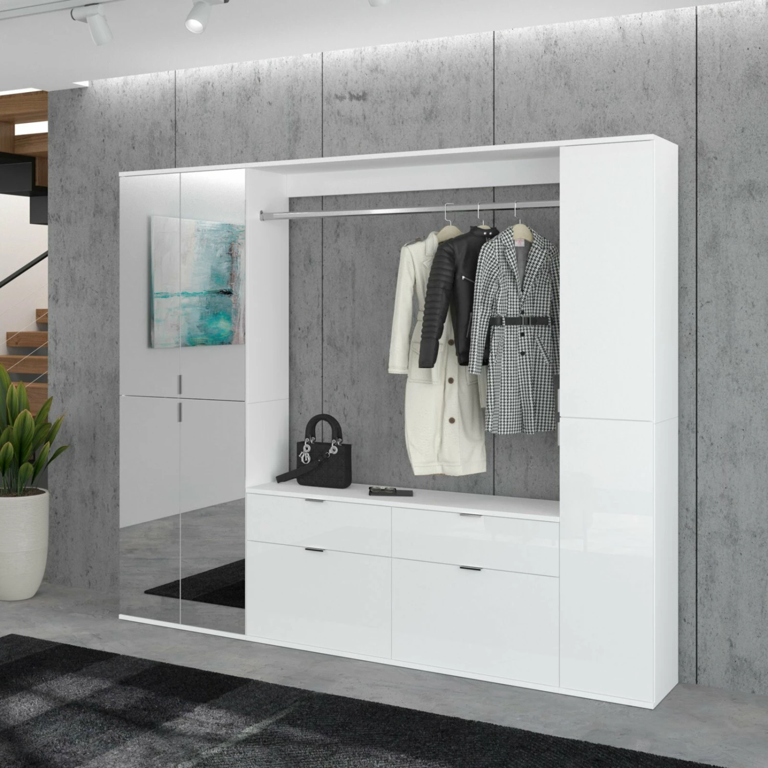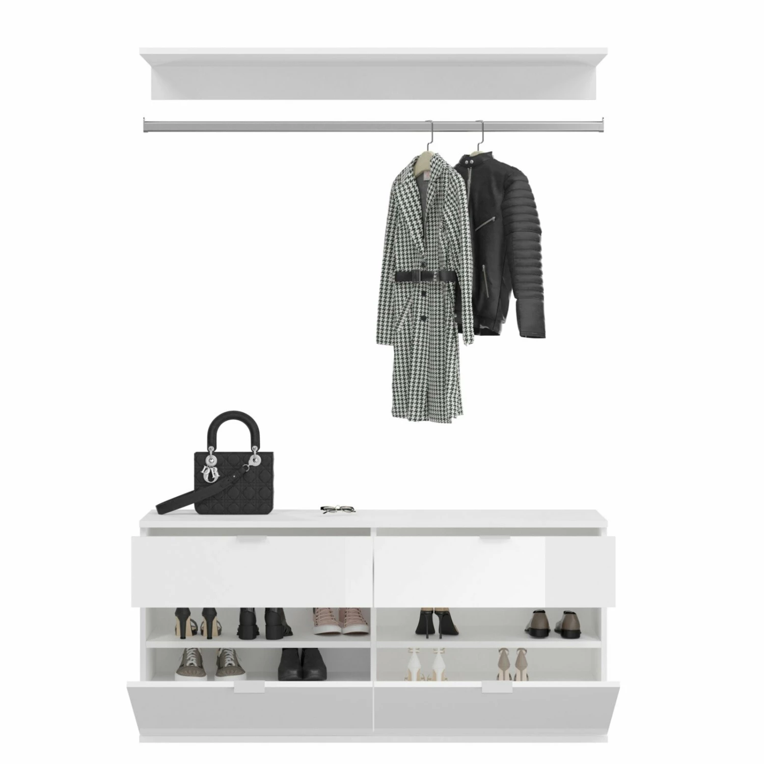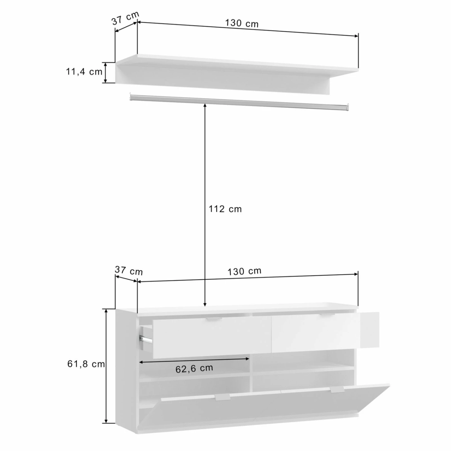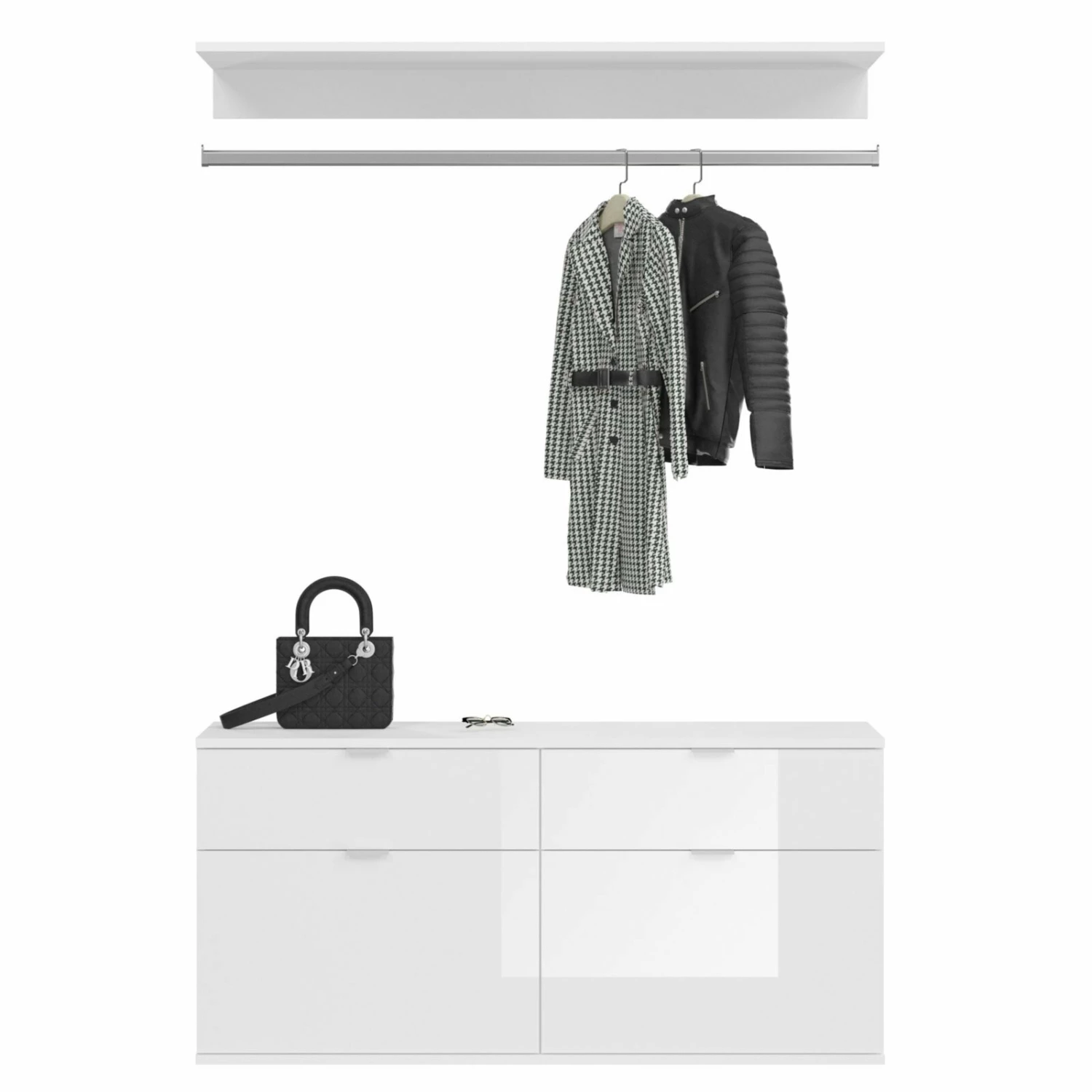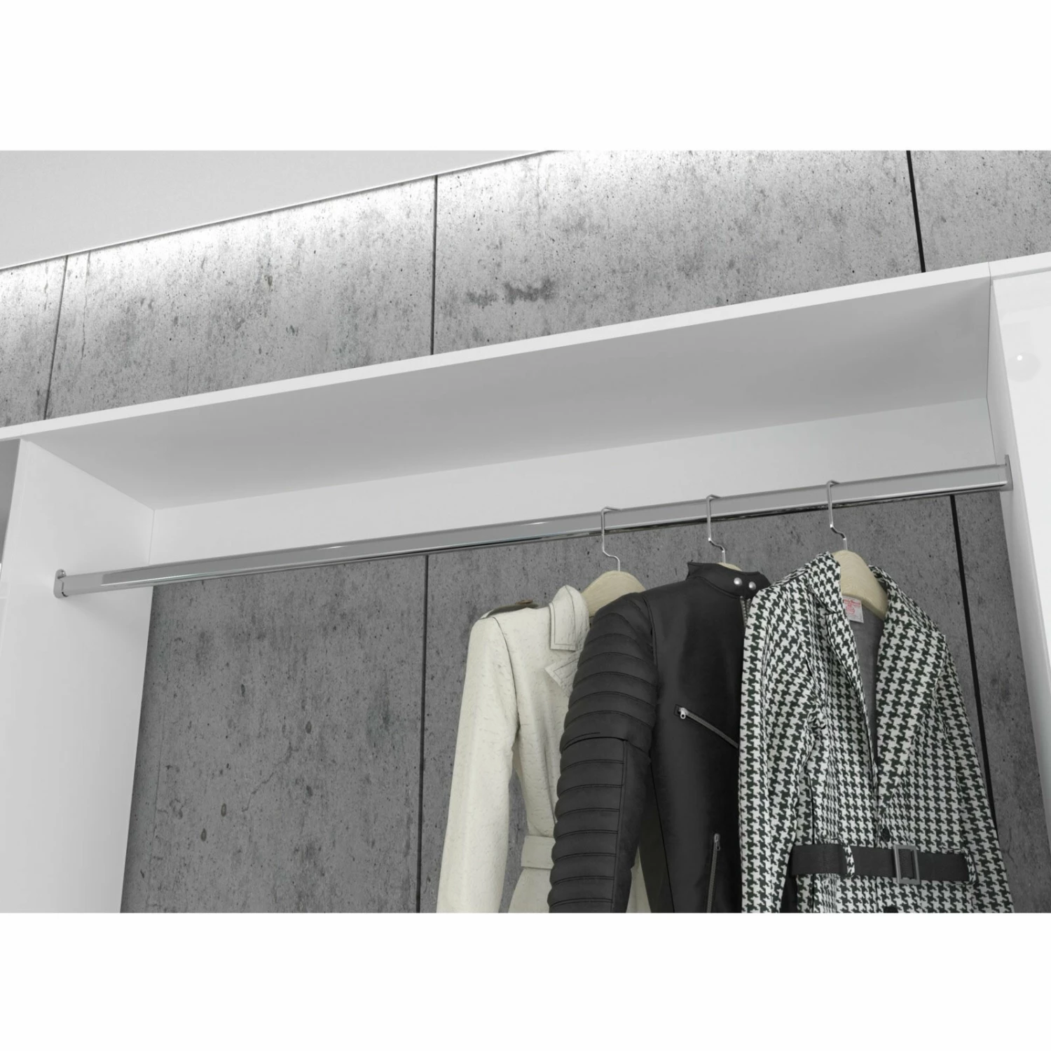Platzieren Sie dieses Zwischenelement zwischen zwei Garderobenschränken und vervollständigen Sie Ihre Garderobe! Durch die Kleiderstange, den Oberboden und die Kommode verfügen Sie fortan über ausreichend Platz, um Ihre täglich benötigte Kleidung wie beispielsweise Jacken zu lagern.